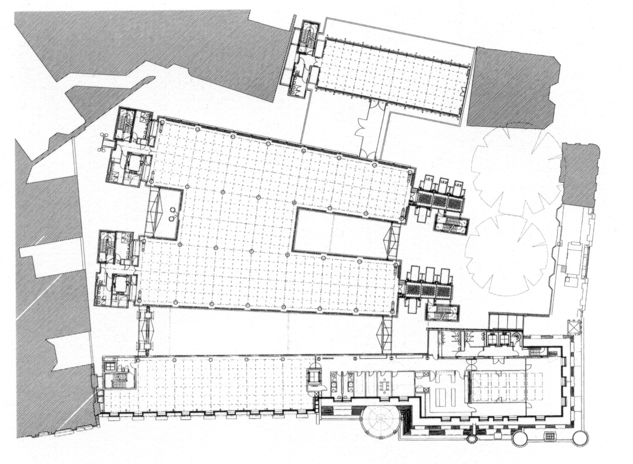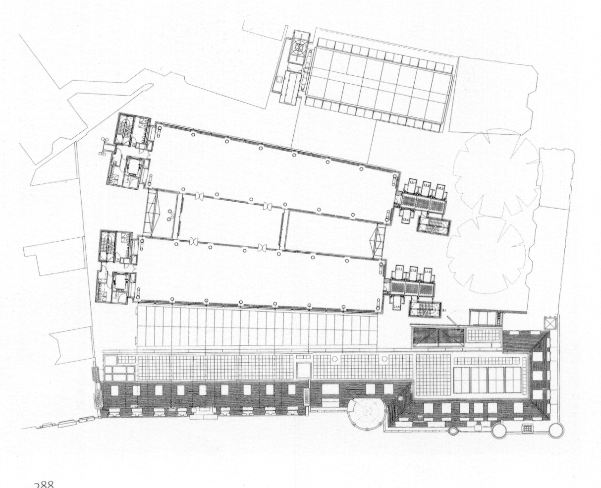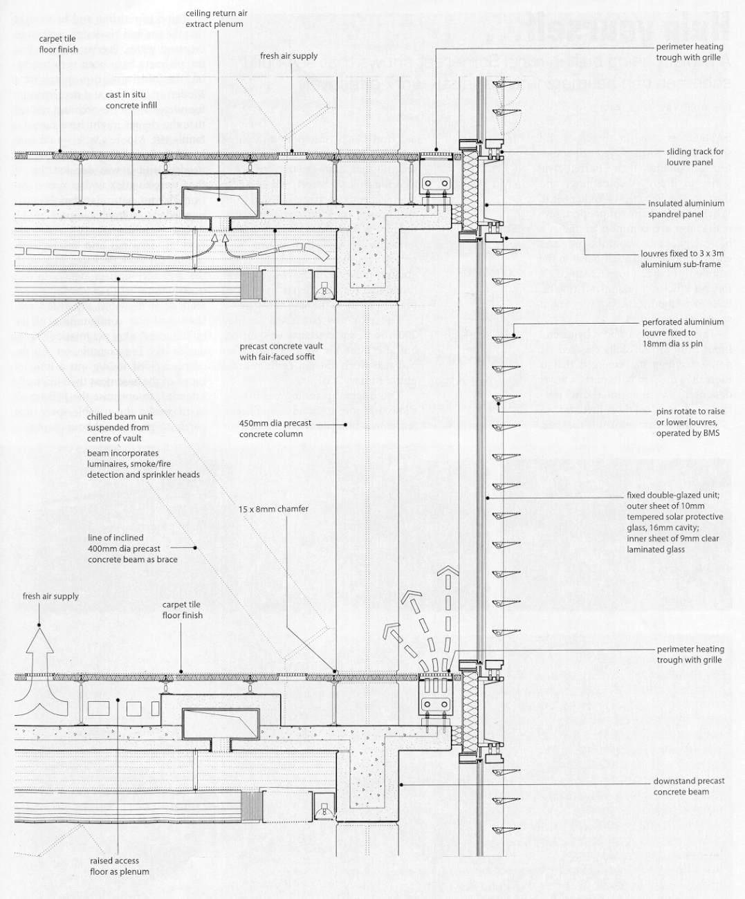 of the main office building consists of an exposed precast concrete frame (beams