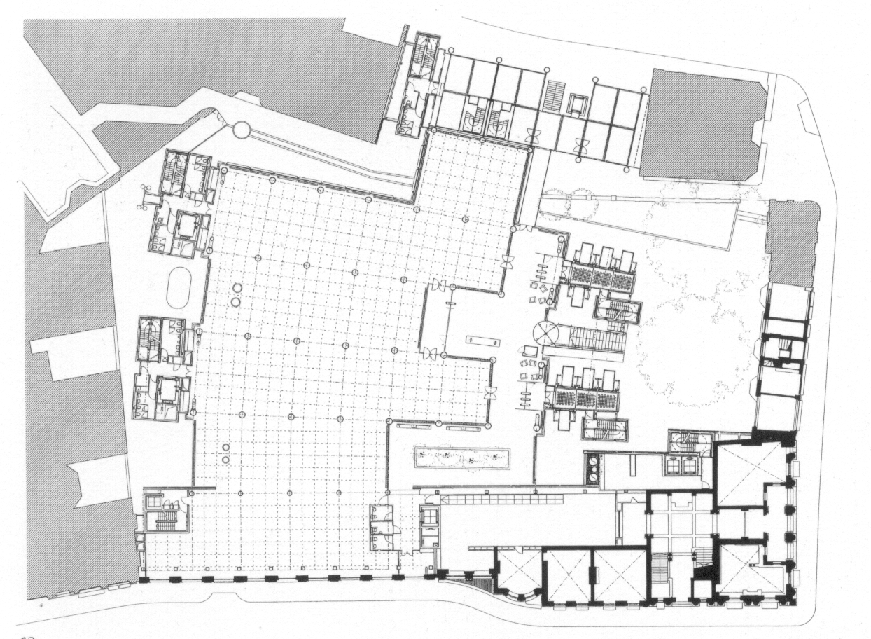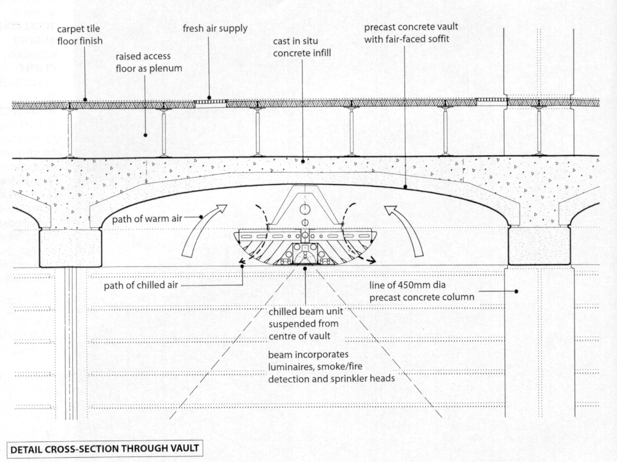 turn, span between the spine beam and the perimeter columns. The vaults are
