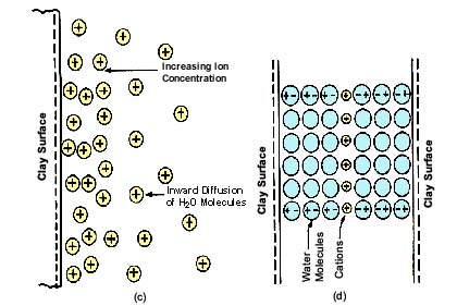 Figure 6.4 Possible mechanisms of water adsorption by clay surfaces. (a) Hydrogen bonding. (b) Ion Hydration. (c) Attraction by osmosis. (d) Dipole attraction